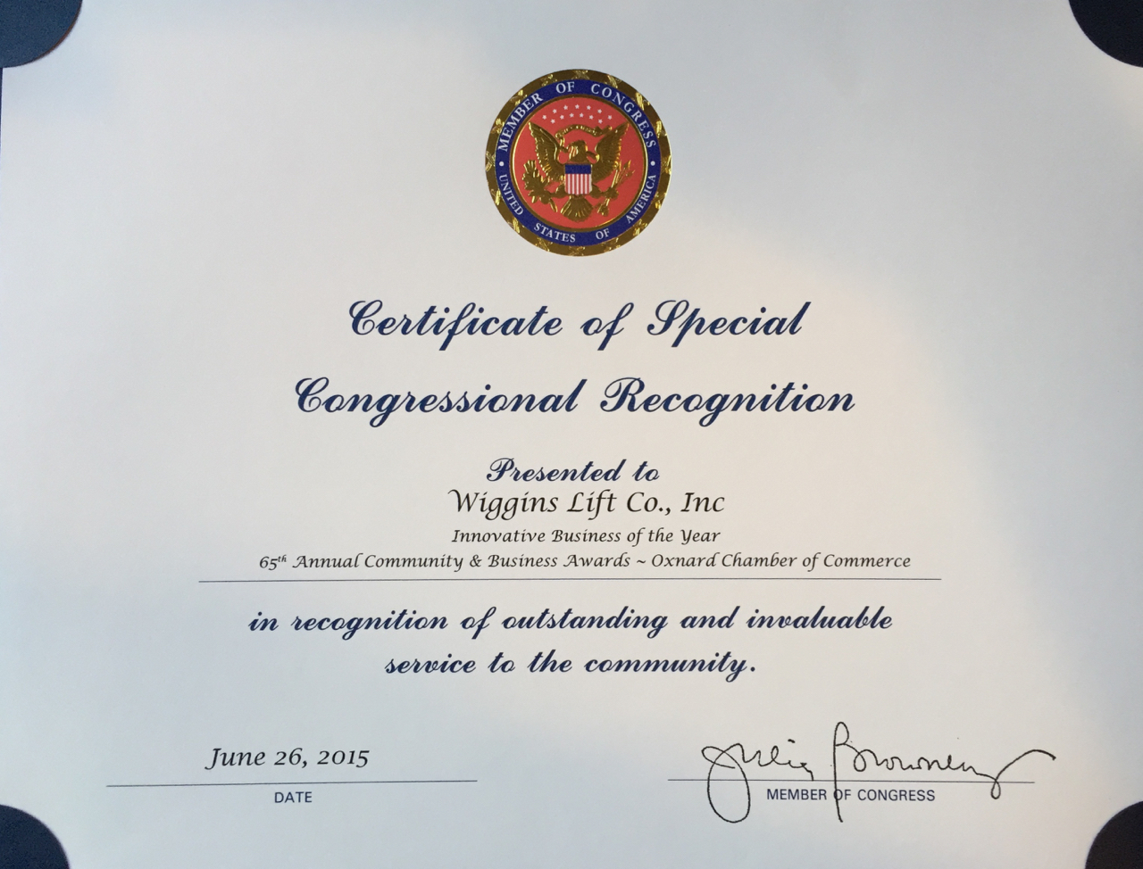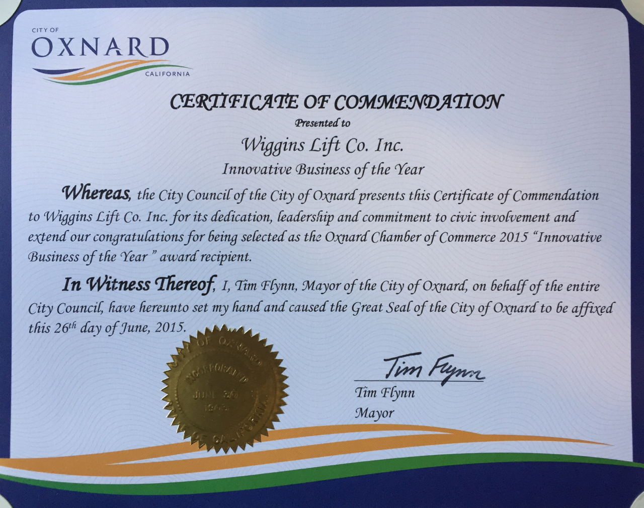 The Oxnard Chamber of Commerce presented Wiggins Lift Co., Inc. with the “Innovative Business of the Year” award at its 65th Community & Business Awards Luncheon on Friday, June 26, 2015 at 11:30 at the Courtyard by Marriott Oxnard.